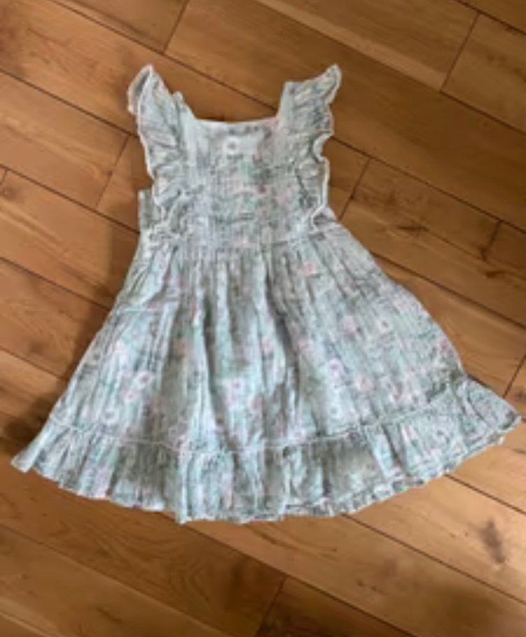 Yurtdışından 6/8 yaş uyumludur. Kız çocuk için kolsuz, rahat kesim bohem elbise. Yumuşak pamuk kumaş, pastel turkuaz / mint yeşili batik desen ve fırfır detaylı. #turkuaz #mint#çiçeklielbise #beyazçiçek #fransız #fırfırlı