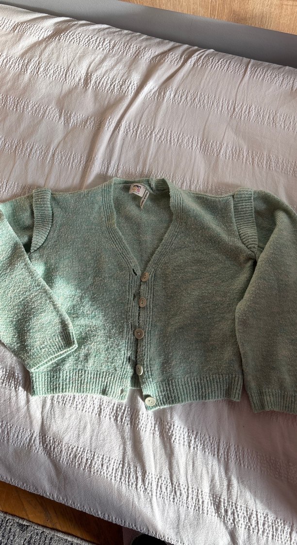 Günlük kullanıma uygun, uzun kollu, yuvarlak yakalı, gevşek kesim pastel yeşil örme kadın hırka. Rahat ve midi boydadır.