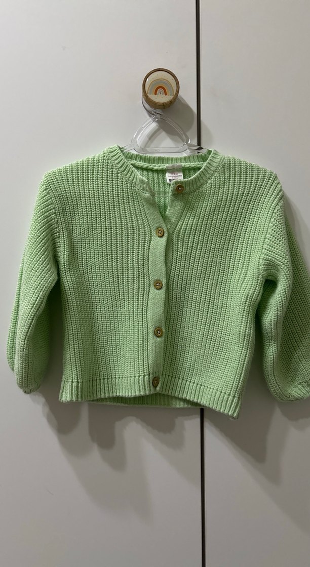 Pastel yeşil renkli, örgü kumaştan yapılmış kız çocuk hırkasıdır. Uzun kollu, bol kesim ve düğmeli kapamalıdır.