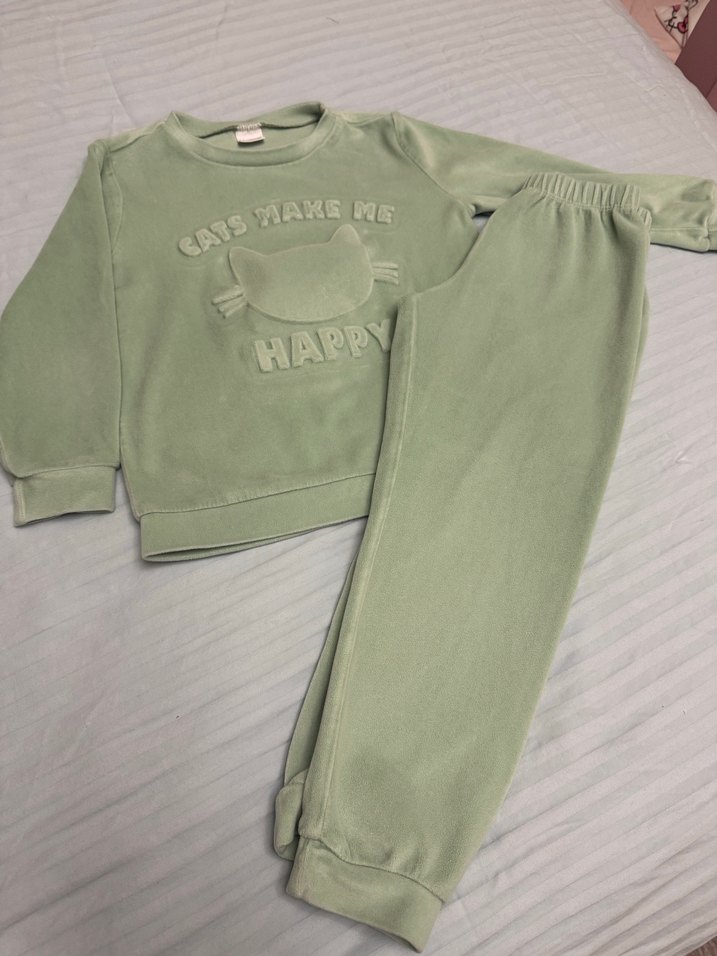 Pastel yeşil renkli kız çocuk eşofman takımı, bol kesim, uzun kollu ve bisiklet yaka. Yumuşak ve sıcak kumaştan, örgü dokulu, "CATS MAKE ME HAPPY" yazılı baskı ve kedi motifi bulunur.