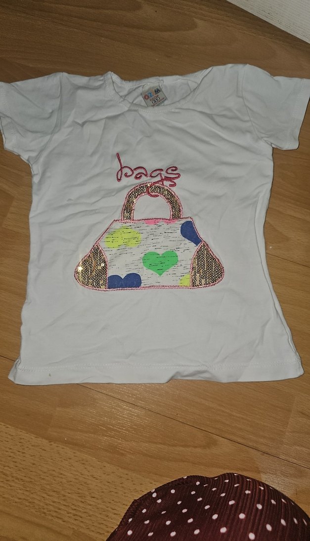 Kız çocukları için beyaz, kısa kollu, yuvarlak yakalı tişört. Payetlerle süslenmiş baskılı çanta deseni bulunur. Sentetik kumaştan yapılmıştır.