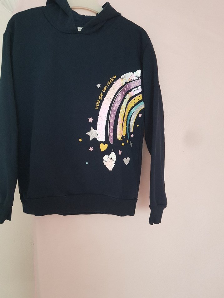 Kız çocukları için uzun kollu kapişonlu Koyu renk üzerine çok renkli payetli gökkuşağı baskısı ve yumuşak, sıcak kumaş içerir.