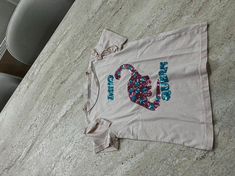 Pamuklu, pembe renk, kısa kollu ve yuvarlak yakalı kız çocuk tişörtü. Payetli baskı detayı ile dikkat çeker. Yeniiii