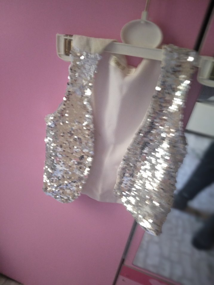 Bu dar kesim, kolsuz bolero, parlak payetler ve nakış detayları ile sentetik kumaştan yapılmıştır, V yaka tasarımıyla çağdaş bir görünüm sunar. ✨