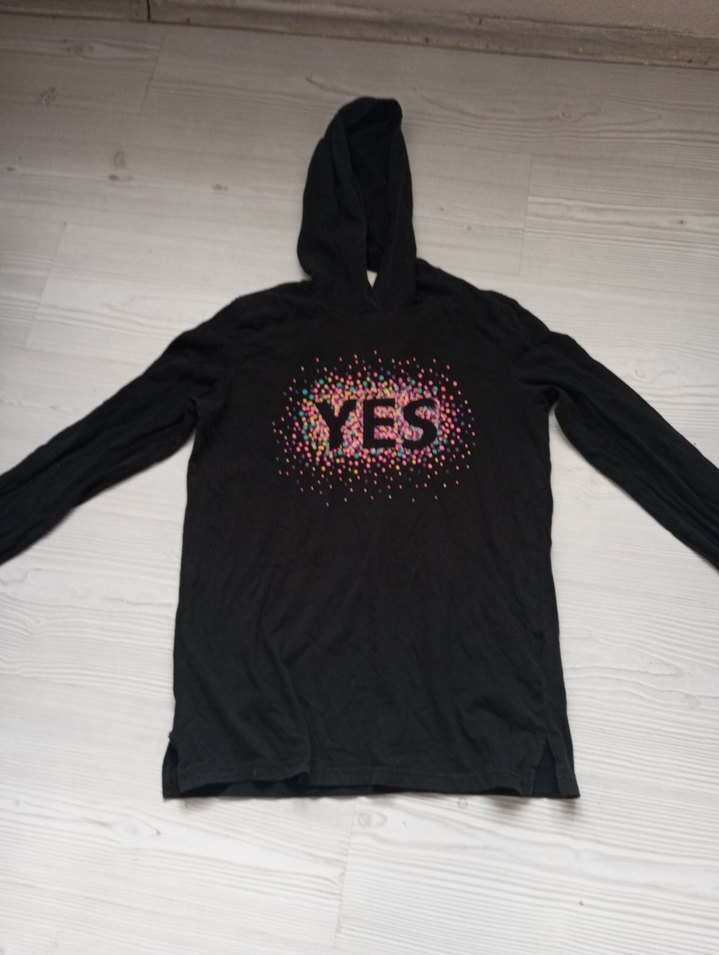 Siyah, uzun kollu kapüşonlu kız çocuk sweatshirtü, bol kesim, payetli ve baskılı "YES" yazılı tasarım. Yumuşak sentetik kumaş. ✨