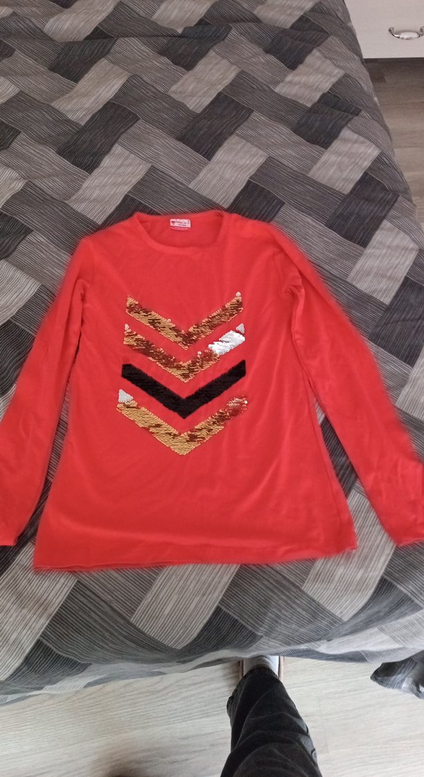 Kız çocukları için uzun kollu, yuvarlak yakalı ve bol kesim kırmızı tişört. Sentetik kumaştan, payetli renkli baskılarla sokak modası tarzında.