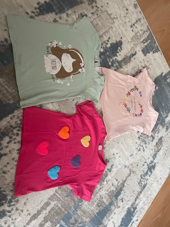 Pamuklu kumaştan, kısa kollu, yuvarlak yaka, bol kesim kız çocuk tişörtü. Pastel renkler, baskılı desenler ve payet detayları ile dikkat çeker. Lcwdan magzadan aldim 3-4 yas icin uygun