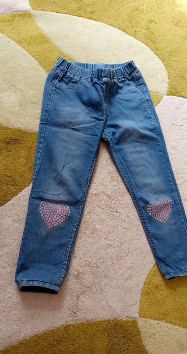 Kız çocukları için bol kesim mavi kot pantolon, dizlerde renkli payetli kalp desenleriyle sokak stiline uygun. Lastikli bel rahatlık sağlar.