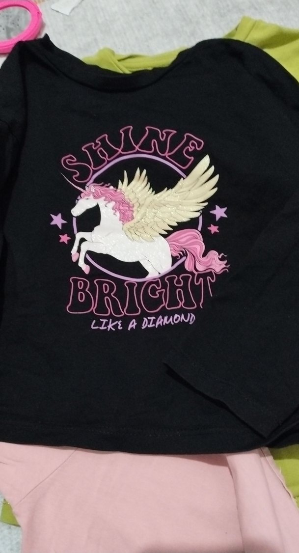 Siyah, vücuda oturan uzun kollu kız çocuk tişörtü, renkli baskı ve payet detaylıdır. Yuvarlak yakalı ve rock punk tarzındadır. Üzerinde "BRIGHT, LIKE A DIAMOND" yazısı bulunur.
