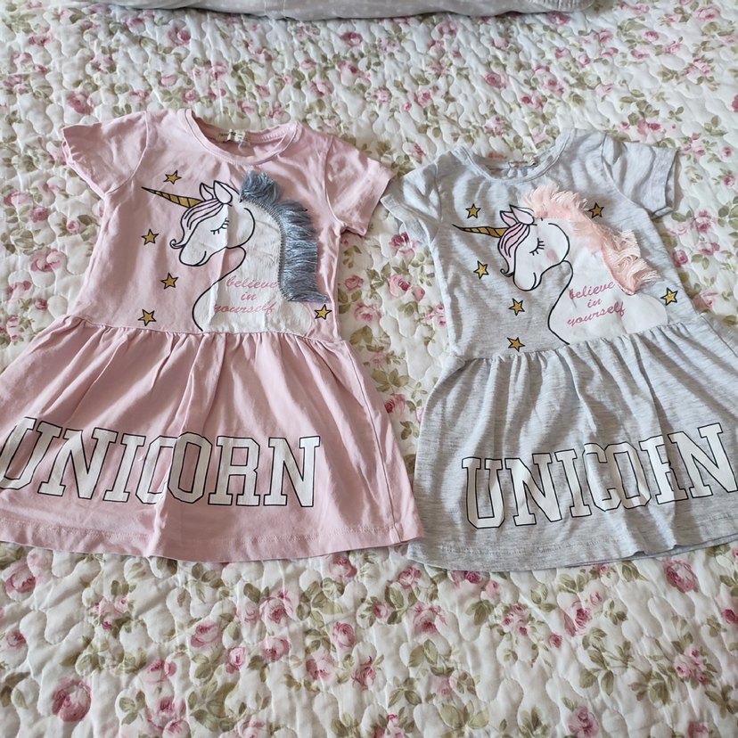 Pamuklu, kısa kollu, yuvarlak yaka, bol kesim kız çocuk elbisesi. Pastel pembe unicorn baskılı, payet ve dokulu detaylı.