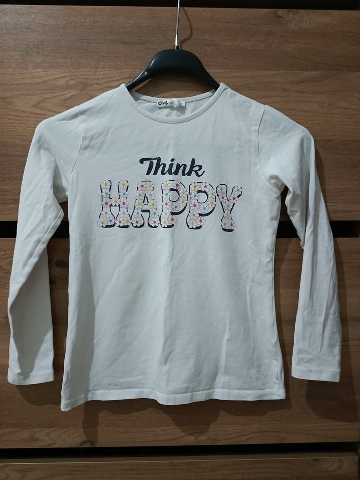 Pamuklu, uzun kollu, bol kesim beyaz tişört. "Think HAPPY" yazısı baskılı ve payetlerle süslenmiş. Bisiklet yaka, rahat sokak stili için uygun.