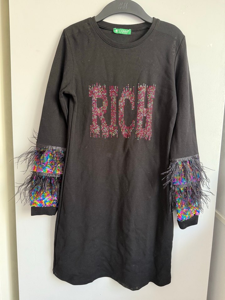 Kız çocukları için uzun kollu, bol kesim sweatshirt elbise. Önünde payetlerle süslenmiş "RICH" yazısı ve kollarında renkli payet ile tüy detayları bulunur.