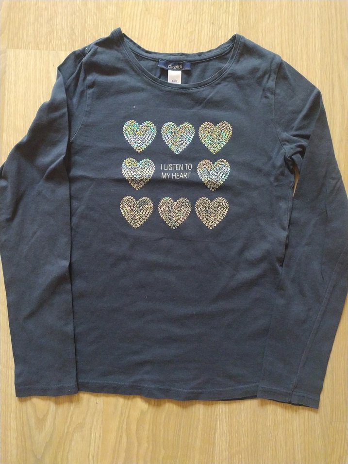Denim kumaştan yapılmış, koyu mavi renkli, uzun kollu, bol kesim kız çocuk tişörtü. Önünde payetli kalp baskıları ve "I LISTEN TO MY HEART" yazısı bulunur.
