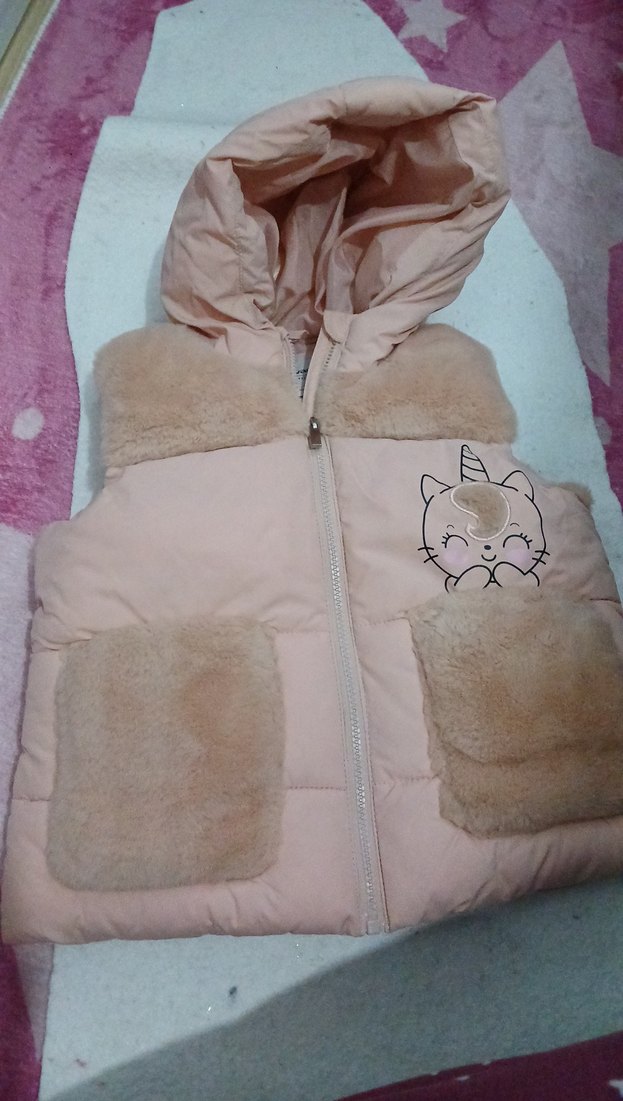 Peluş detaylı yakası ve cepleri olan pembe kız çocuk yeleği, nakışlı tek boynuzlu desenli, fit kesim ve askısız yakalı sokak stili.