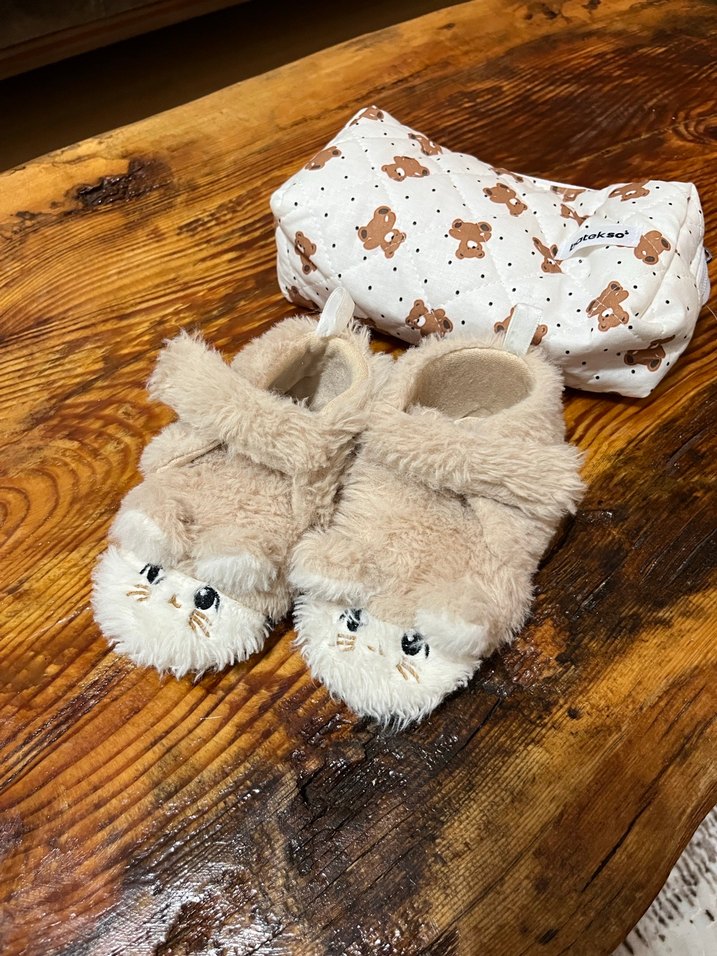 Kız çocukları için yumuşak peluş detaylı, ön kısmında sevimli hayvan yüzü bulunan sıcak bej tonlarında ev terliği.