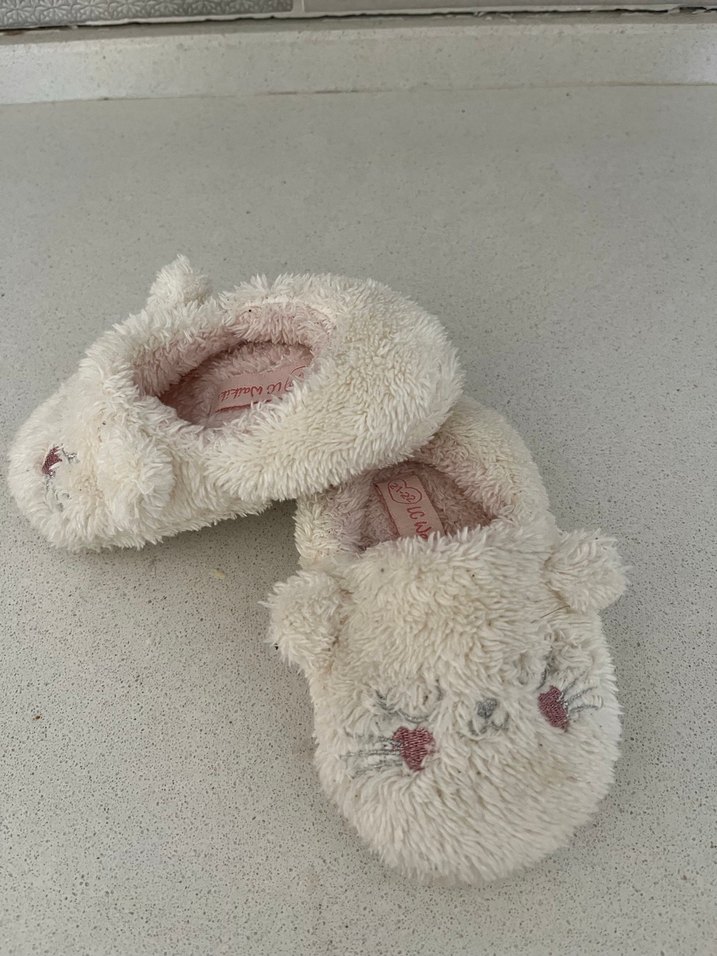 Kız çocukları için yumuşak ve sıcak peluş kumaştan, beyaz pastel renkte, kürklü ve işlemeli desenli ev terlikleri. Rahat ve sade tasarım sunar.