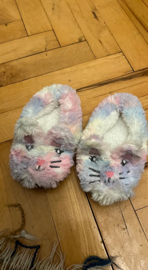 Peluş detaylı, pastel çok renkli batik desenli kız çocuk terlikleri, yumuşak ve sıcak iç yüzeyli, sevimli hayvan yüzü desenli.