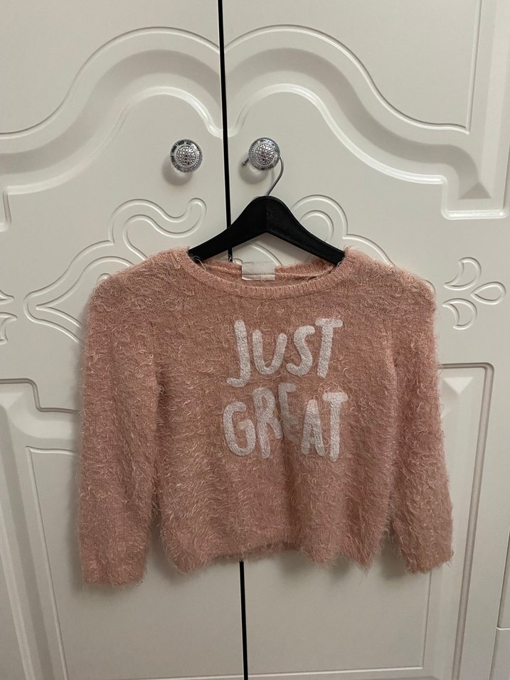 Pembe renkli, uzun kollu, salaş kesim mini triko kazak. Üzerinde "JUST GREAT" yazılı baskı bulunur. Günlük ve rahat sokak stili için uygundur.