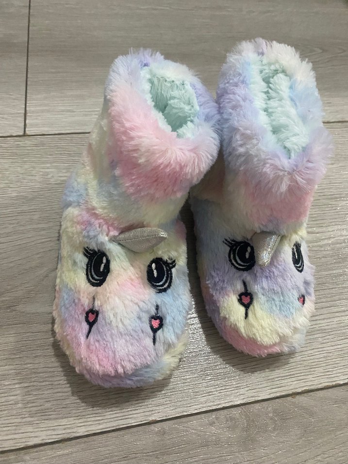 Kız çocukları için peluş, pastel tonlarda tie-dye desenli, kürklü ve unicorn yüz detaylı sıcak ev terliği.