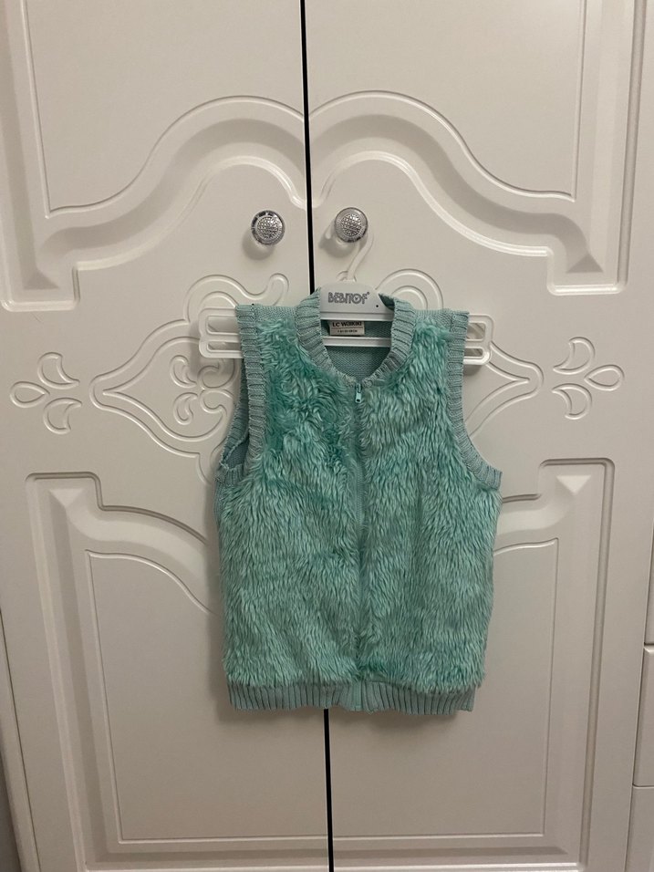 Turkuaz renkli, örgü dokulu, kolsuz ve fitted kesim yelek. Yuvarlak yaka ve hafif batik desenlidir, rahat ve sıcak tutar.