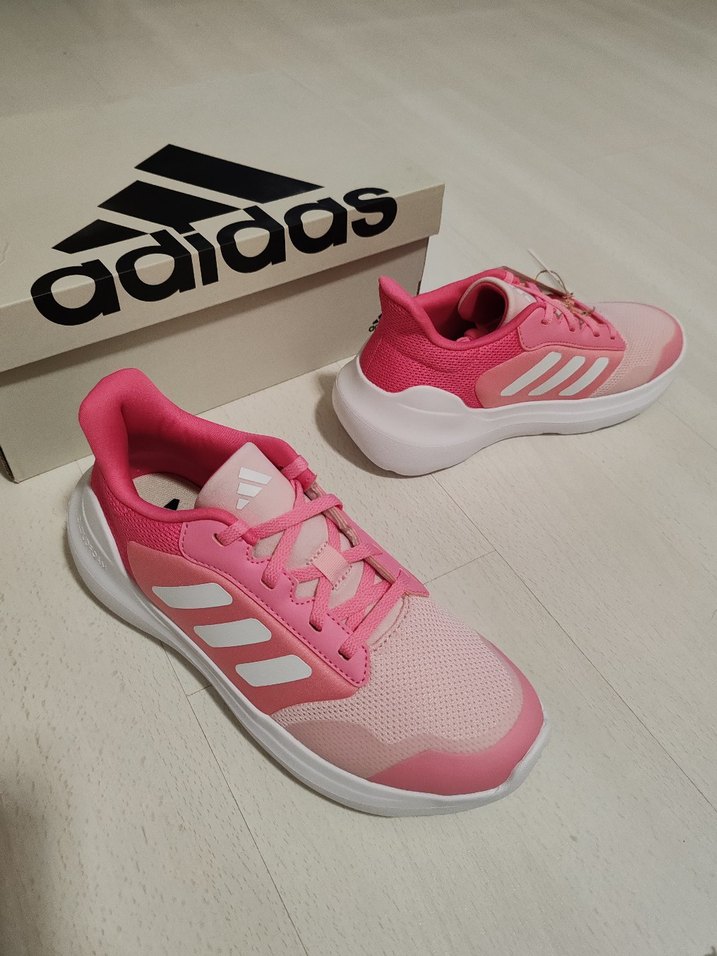 Pembe renkli, bağcıklı ve baskılı tasarıma sahip Adidas kız çocuk spor ayakkabısı, rahat kauçuk tabanlıdır.