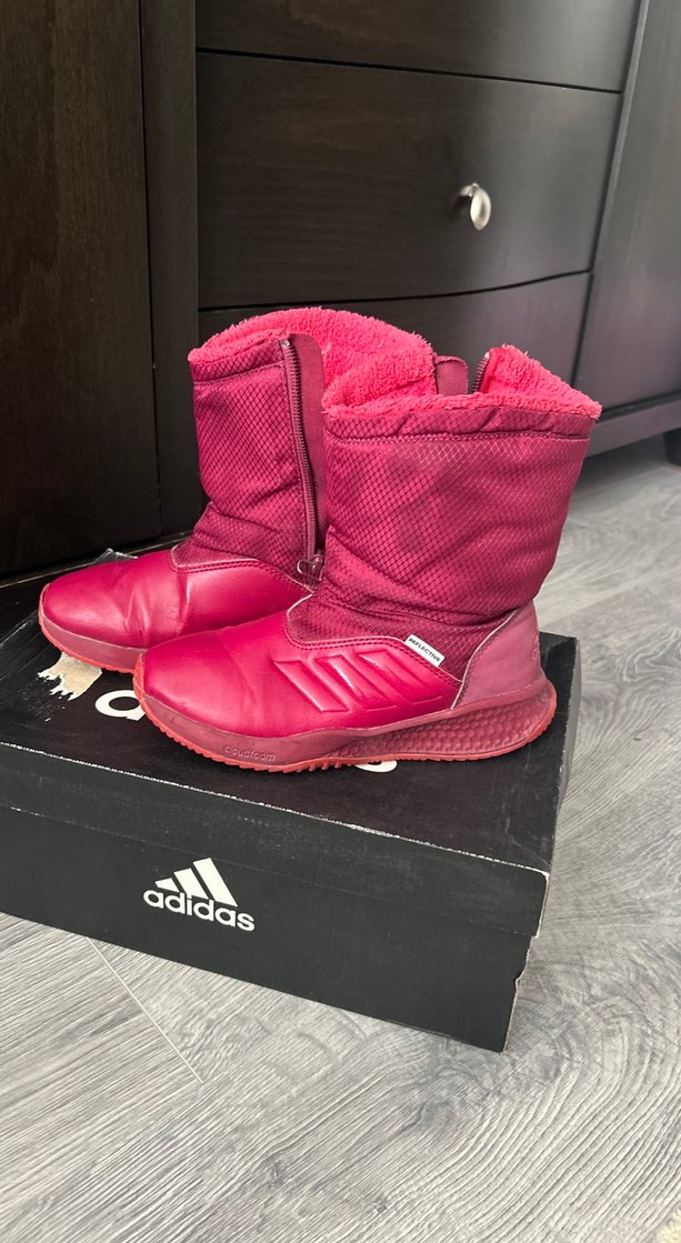 Pembe Adidas kız çocuk botları, kolay kullanım için cırt cırtlı ve kauçuk tabanlıdır. Renkli, desensiz, rahat iç astara sahiptir.