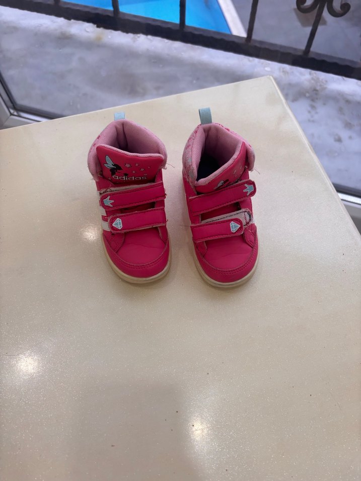 Kız çocuklar için renkli baskılı, pembe tonlarda ve kolay kullanım sağlayan velcro bantlı spor ayakkabılar. Kauçuk tabanlı, trend sokak stili için uygun. #adidas #adidasbot #çocukbot #bebekbot