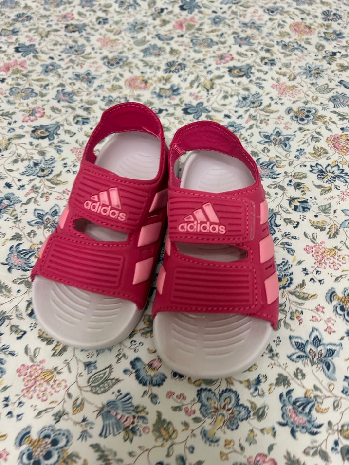 Kız çocuklar için pembe Adidas sandaletler, renkli baskılı detaylar ve kolay kullanım için cırtcırtlı bant içerir. Dayanıklı kauçuk malzemeden üretilmiştir.