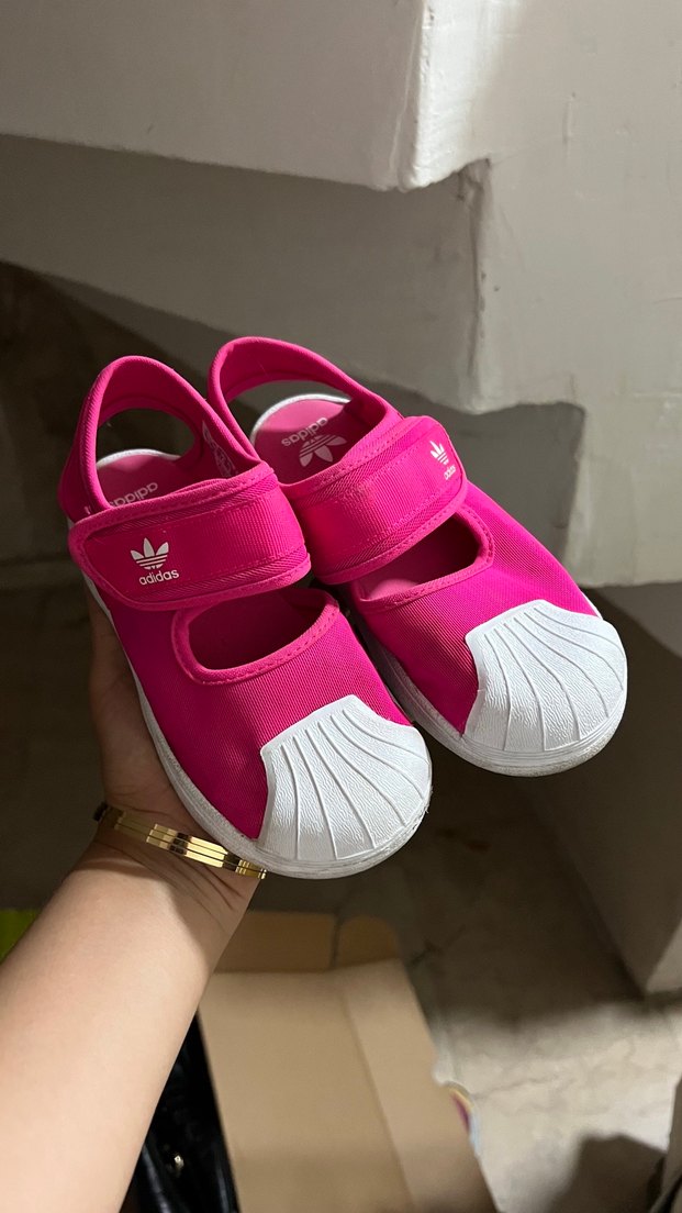 Pembe Adidas kız çocuk terliği, cırtlı bantlı ve beyaz kabuk burun detaylı, dayanıklı kauçuk malzemeden, sokak stili için uygun.