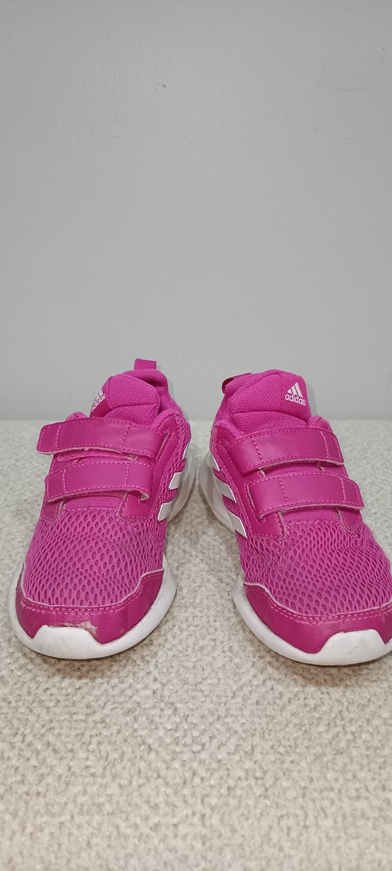 Kız çocuklar için pembe Adidas spor ayakkabı,sağ ön kısımda ufak bir aşınma var,aynı renk oje ile filan kapatılabilir.Bunun dışında gayet iyi durumda, fotoğraflarda da kalitesi görünmektedir.Cırt cırtlı bantlar ve kauçuk tabanlı, trend sokak stili için uygun. 33 Numara / 20 cm