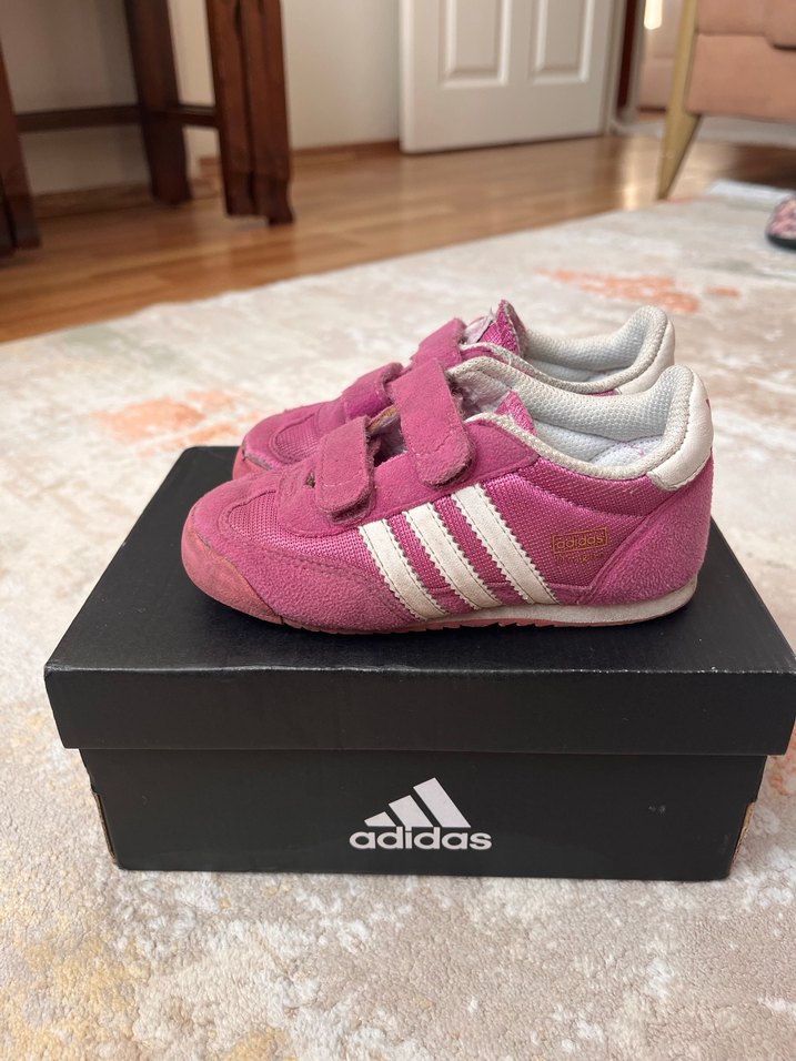 Pembe Adidas kız çocuk spor ayakkabısı, cırt cırtlı ve baskılı tasarımlı, kauçuk tabanlı sokak stili ayakkabı .