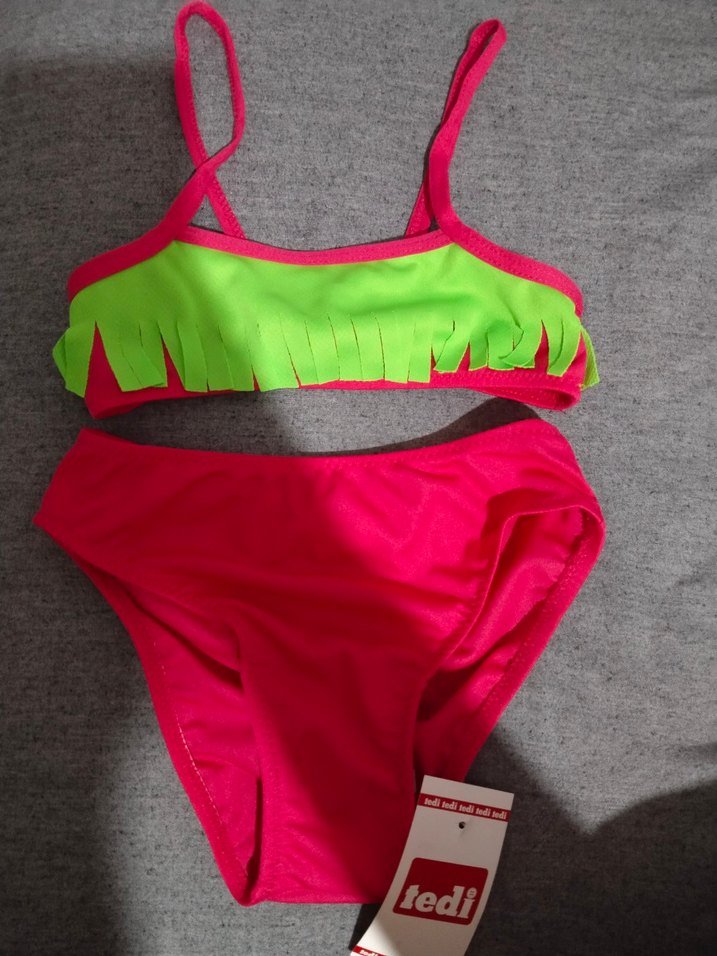 Renkli pembe askılı bikini, üst kısmında püskül detaylıdır. Plaj için uygundur ve tedi markasının etiketi bulunmaktadır. 3 4 yaş yazıyor etikette ama 9 ay 9bucuk kilo bebeğime tam oluyor