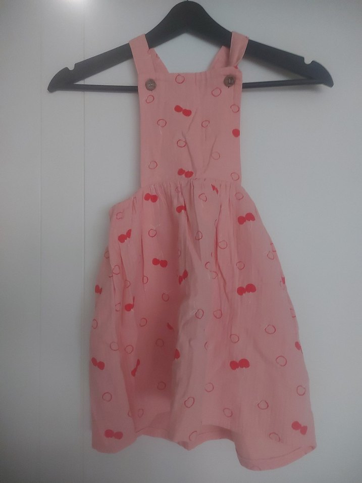 Pembe, askılı, düğmeli ve baskılı kiraz desenli, bol kesim kız çocuk elbisesi. Yumuşak sentetik kumaştan, trend sokak stili için uygun.