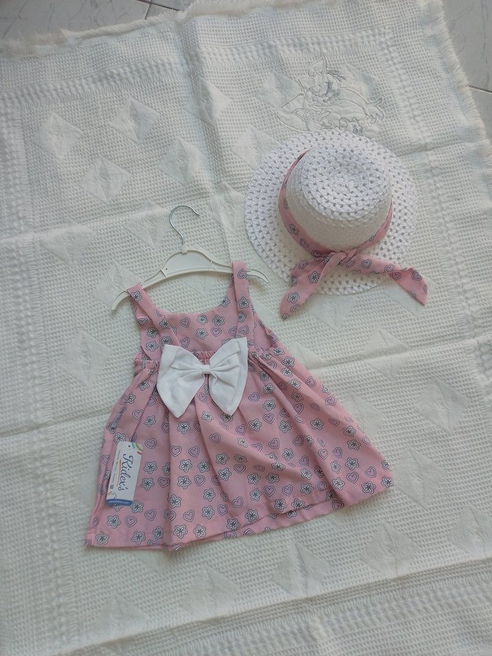 Kız çocukları için pembe askılı, pastel tonlarda batik desenli elbise, büyük beyaz fiyonk ile süslenmiştir. 9-12-18-24 aylik