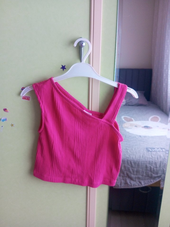 Kız çocuklar için pembe, askısız, fitilli ve pileli detaylı sentetik kumaştan üretilmiş üst, günlük sokak stili için uygundur. az giyildi 9-10 yaşa olur