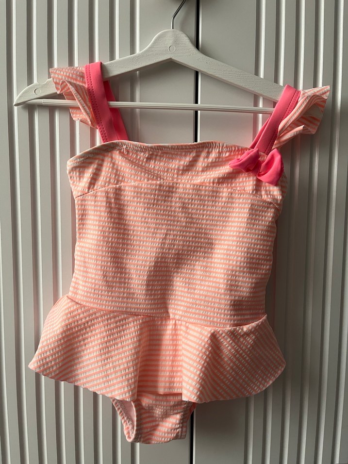 Kız çocukları için askılı, pastel pembe renkte ve ince desenli mayo. Bel kısmında eteği vardır, plaj ve günlük kullanım için uygundur.