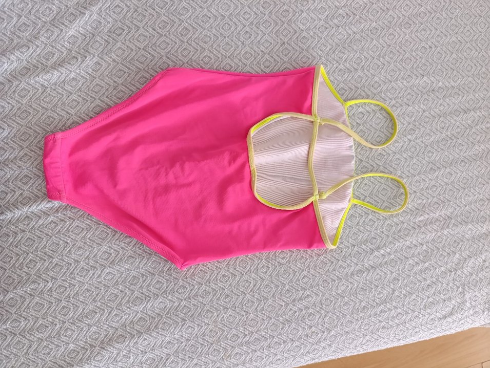 Kız çocukları için askılı, pembe ve sarı detaylı mayo. Plajda kullanıma uygun, çağdaş tarzda ve hafif batik desenli.