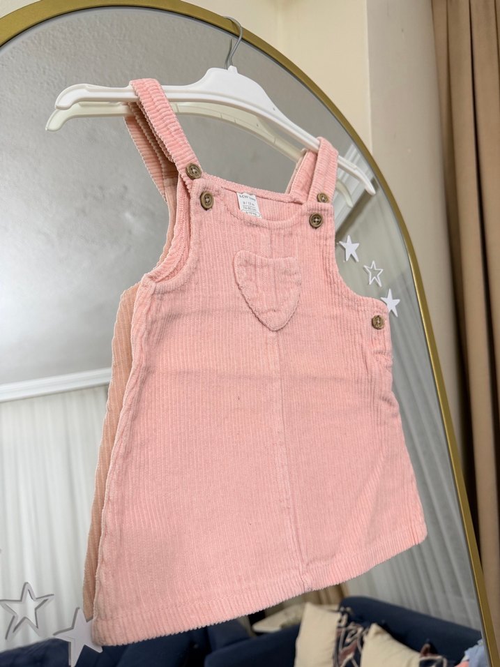 Pastel pembe, askılı pamuk elbise, düğmeli detaylı ve bol kesimdir, rahat ve şık bir görünüm sunar.