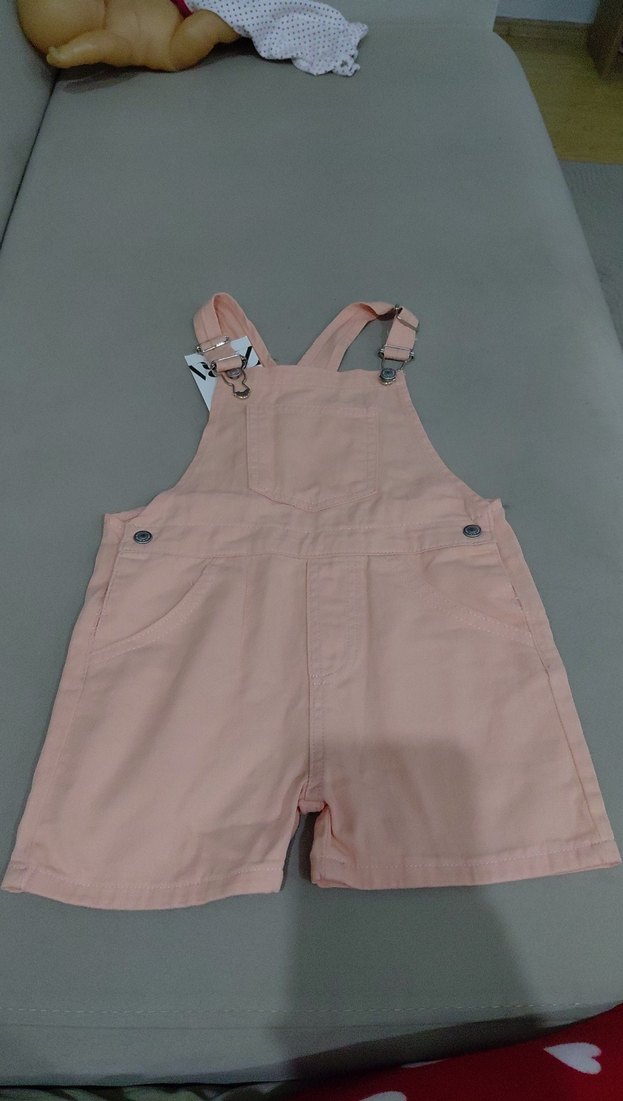 Kız çocukları için askılı, tokalı ve bol kesim pembe şort tulum. Sentetik kumaştan, sokak tarzına uygun.