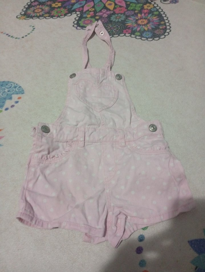 Düğmeli, hafif batik desenli, pembe askılı ve bol kesim kız çocuk tulumu, yumuşak sentetik kumaştan üretilmiştir.