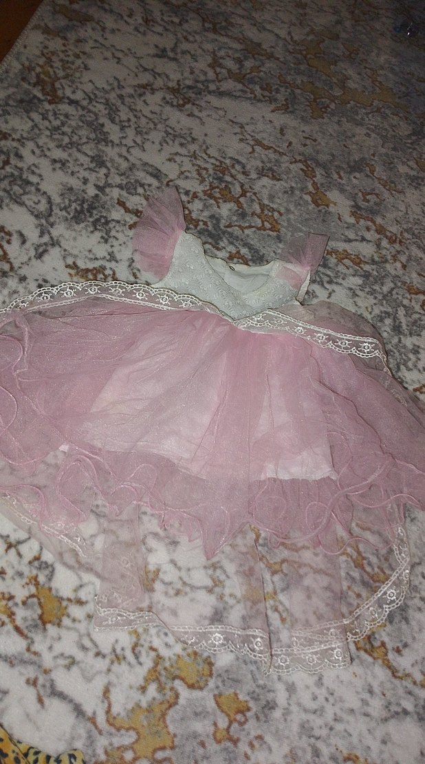 Pembe pastel renk, askısız, dantel işlemeli ve bol kesim kız çocuk elbisesi, sentetik kumaştan üretilmiştir.