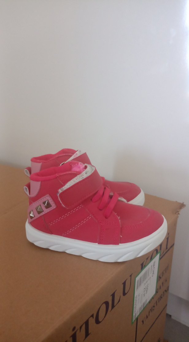 Kız çocukları için canlı pembe renkte, kaymaz tabanlı ve Velcro bantlı spor ayakkabılar. Sokak stiline uygun sade tasarım. Ürün kullanılmıştır fakat hiçbir hasarı yoktur.