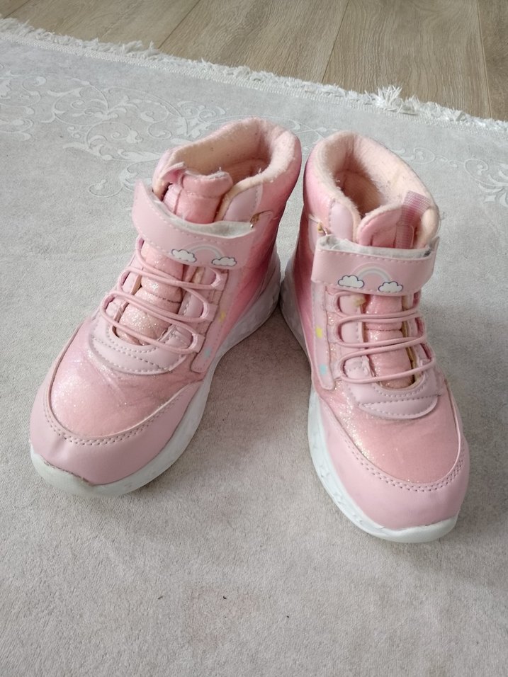 Kız çocukları için pastel pembe tie-dye desenli, yumuşak içi fleece ve kürk detaylı botlar, rahat sokak stili için uygun.