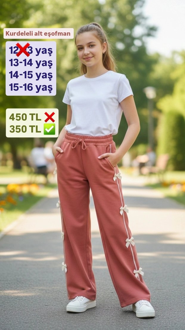 Kız çocuklar için yanlarda kurdele detaylı, rahat kesim pembe pamuklu eşofman, elastik bel kısmıyla konfor sağlar.