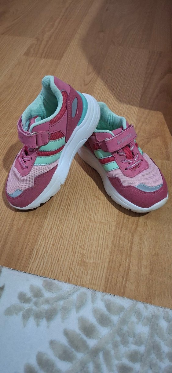 Lastikli bantlı, bağcıklı ve bağlama deseni olan pastel pembe kız çocuk spor ayakkabısı. Kauçuk tabanlı, sokak stili için uygun. sadece 1 defa giyildi