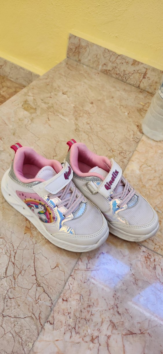 Kız çocukları için renkli tie-dye desenli, pembe ve gümüş detaylı spor ayakkabılar. Yumuşak kürk astarlı ve kolay kullanımlı cırt cırtlı bantlara sahiptir. Trend sokak stili için uygundur. az kullanildi sorunsuz