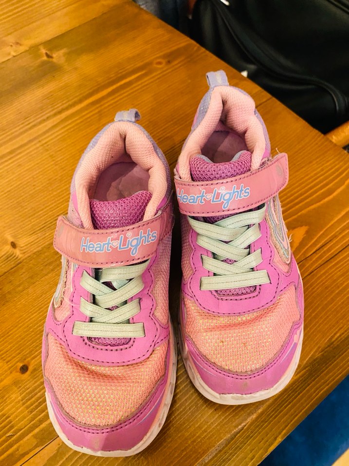 Kız çocuklar için renkli pembe bağcıklı ve cırtlı spor ayakkabılar. Kauçuk tabanlı, Heart-Lights yazılı, tie-dye desenlidir.