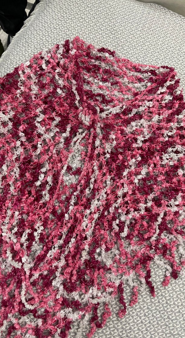 Kız çocuklar için pembe ve gri bağlama desenli, örgü, bol kesim, kayık yaka ve askılı kollu bohem tarzda panço.