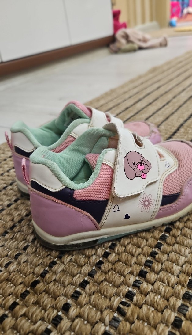 Pastel pembe renkli, köpek desenli ve velcro bantlı kız çocuk spor ayakkabısı. Kauçuk tabanlı, rahat sokak stili için uygun.