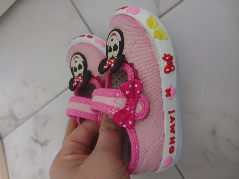 Pembe kız çocuk sneaker, renkli baskılı taban ve kolay kapanan cırt cırt bantlı. Kafatası ve fiyonk detaylı rock punk tarzında.